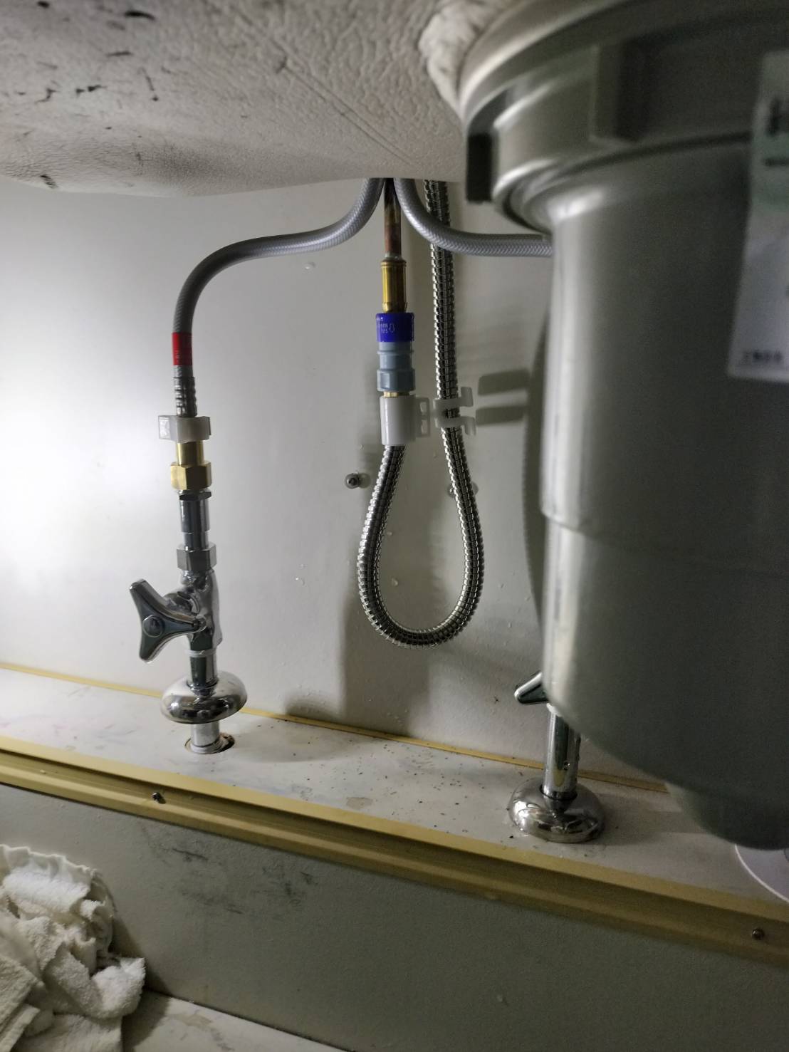 給水管と給湯管どちらも短いのでナット付アダプタで延長します。(金色)