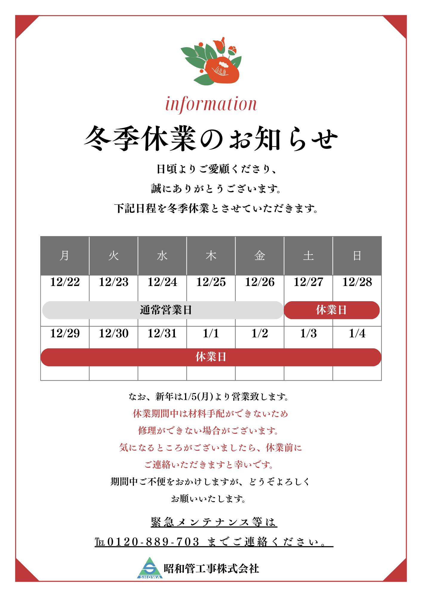 冬季休業のお知らせ 2025/12/08 12月27日(土)〜1月4日(日) まで冬季休業とさせていただきます。 1月5日(月)より営業致します。 休業期間中は材料手配ができないため修理ができない場合がございます。 気になるところがございましたら休業前にご連絡いただきますと幸いです。 期間中ご不便をおかけしますが、どうぞよろしくお願いいたします。 緊急メンテナンス等は TEL 0120-889-703 までご連絡ください😊