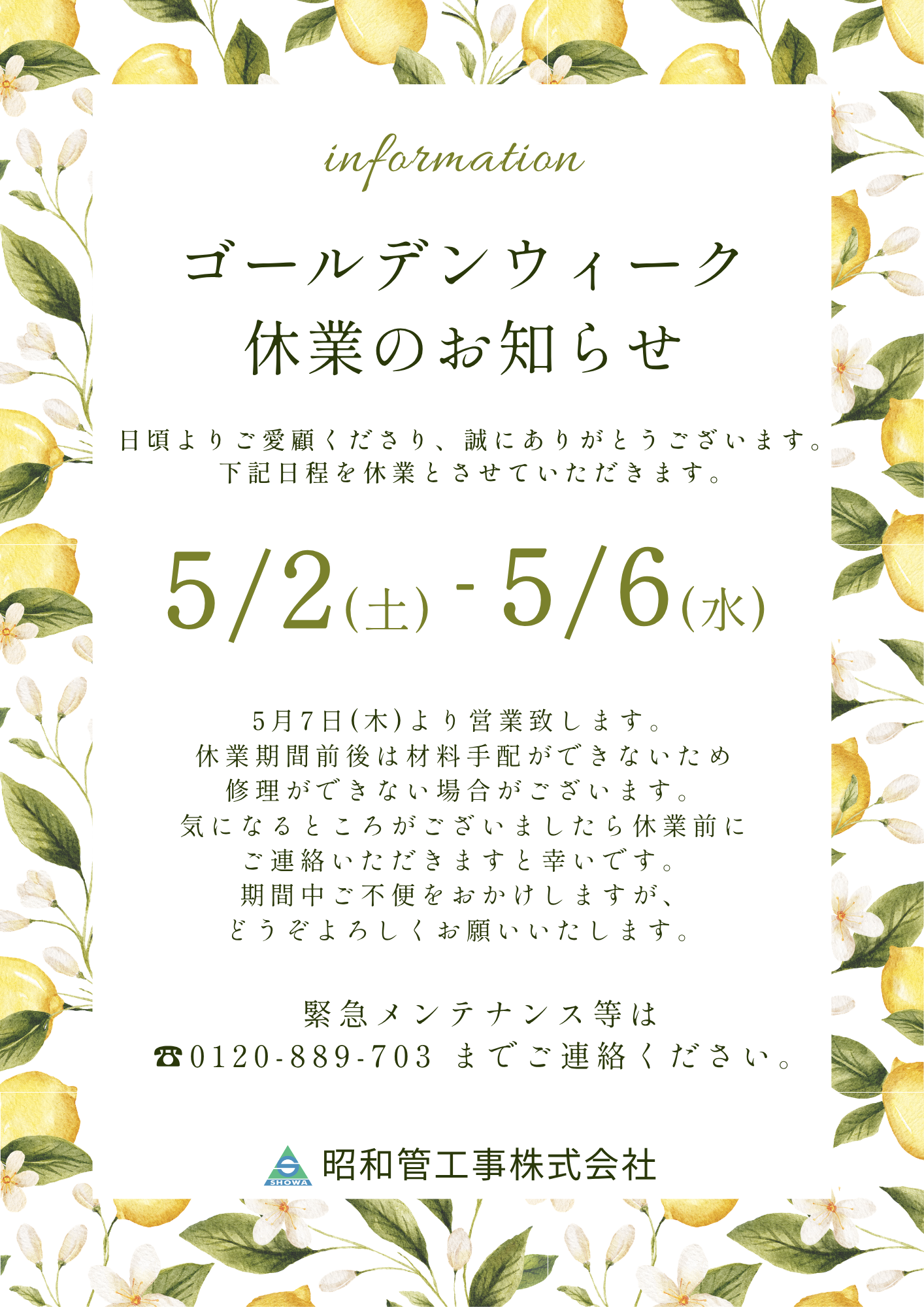 ゴールデンウィーク休業のお知らせ 2026/04/10 日頃よりご愛顧くださり、誠にありがとうございます。 下記日程を休業とさせていただきます。 4/29(水)、5/2(土)~5/6(水) 5月7日(木)より営業致します。 休業期間中は材料手配ができないため修理ができない場合がございます。 気になるところがございましたら休業前にご連絡いただきますと幸いです。 期間中ご不便をおかけしますが、どうぞよろしくお願いいたします。 緊急メンテナンス等は TEL 0120-889-703 までご連絡ください。